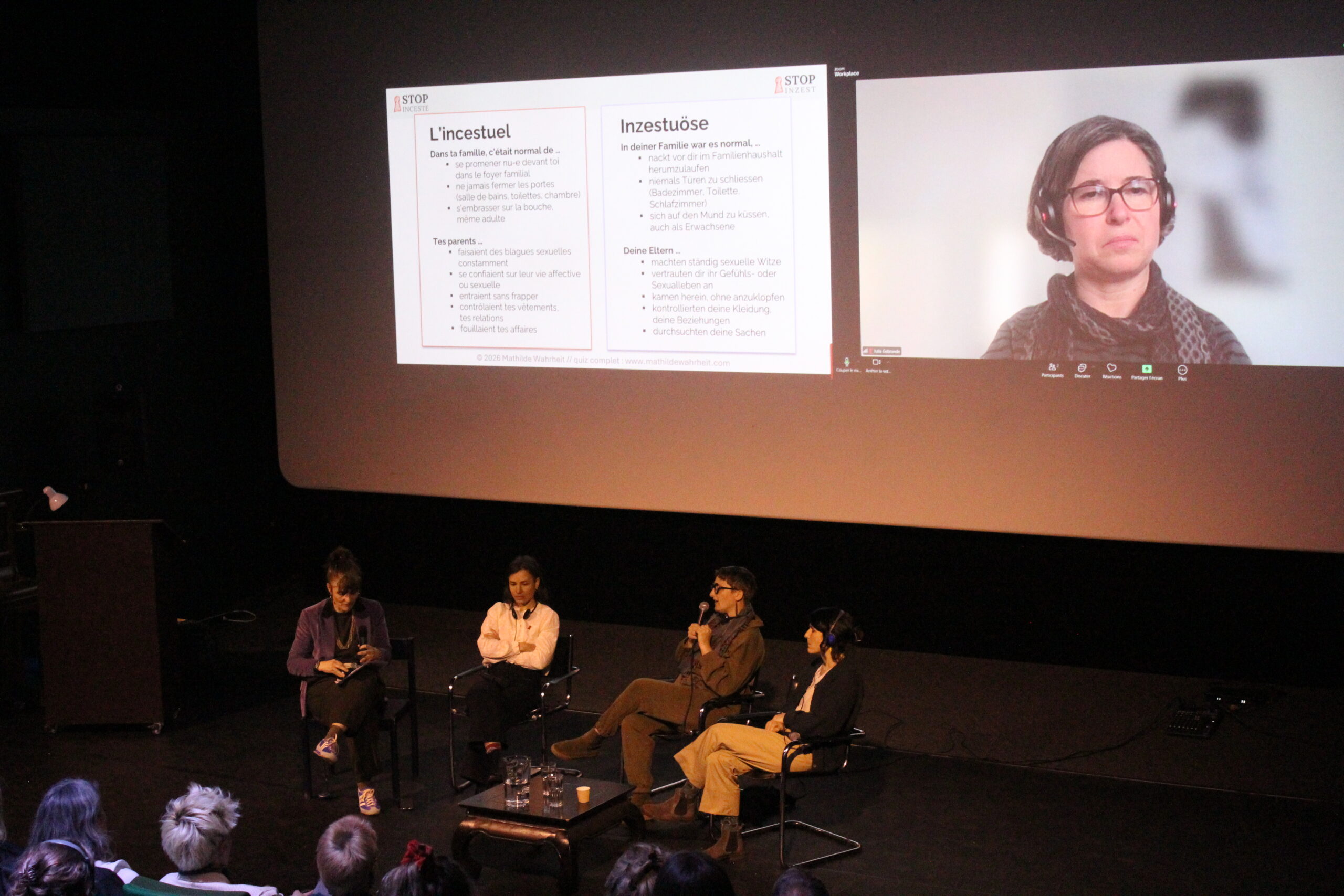 Une table ronde et un dialogue avec le public a réuni Cécile Cée, autrice et spécialiste de la question, Hélène Merlin, réalisatrice et comédienne, Yvonne Kneubühler, directrice de Fachstelle Limita spécialisée dans la prévention des abus sexuels et Julia Gebrande, présidente de la Commission allemande indépendante chargée d’enquêter sur les abus sexuels sur enfants.