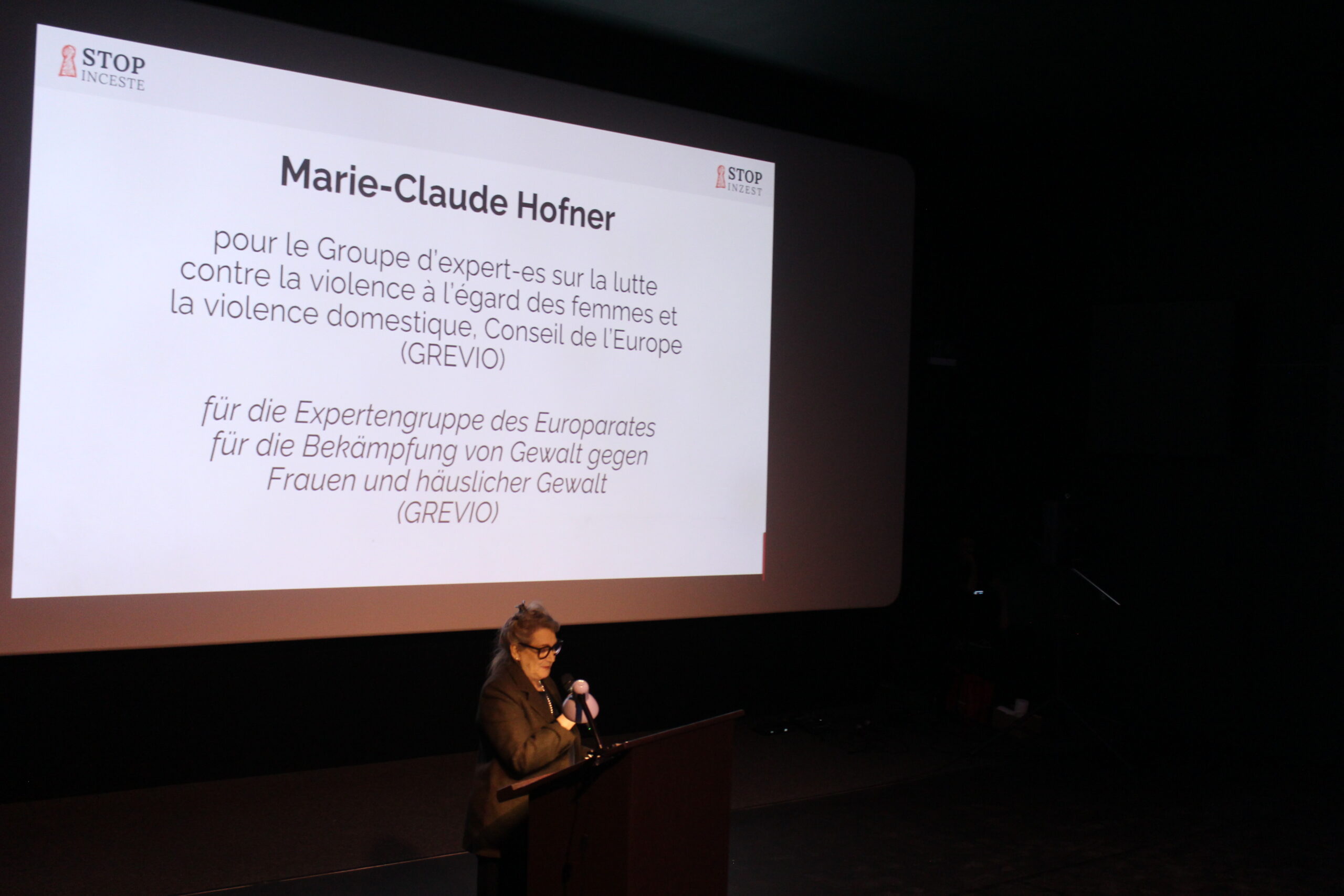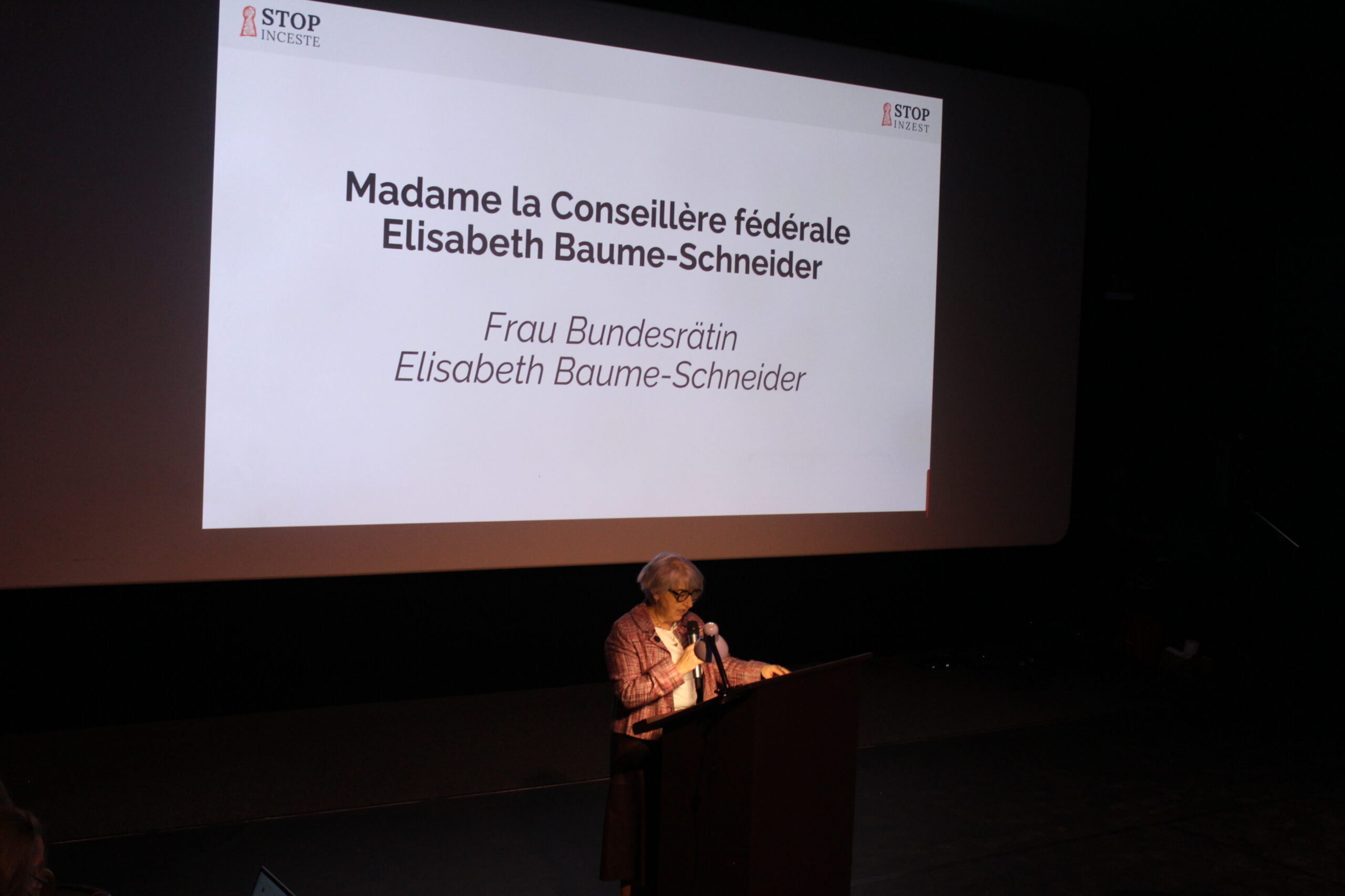 En allocution d’ouverture, Madame la Conseillère fédérale Elisabeth Baume-Schneider a relevé la nécessité d’une responsabilité collective face aux victimes et survivant·e·s d’inceste et de l’importance de briser le déni sociétal. La Dre méd. Marie-Claude Hofner a porté la voix et les mots de soutien du GREVIO (Groupe d’experts sur la lutte contre la violence à l’égard des femmes et la violence domestique pour le Conseil de l’Europe) devant un public nombreux, composé d’environ 110 personnes concernées, de professionnel·le·s, d’artistes et de politiques.