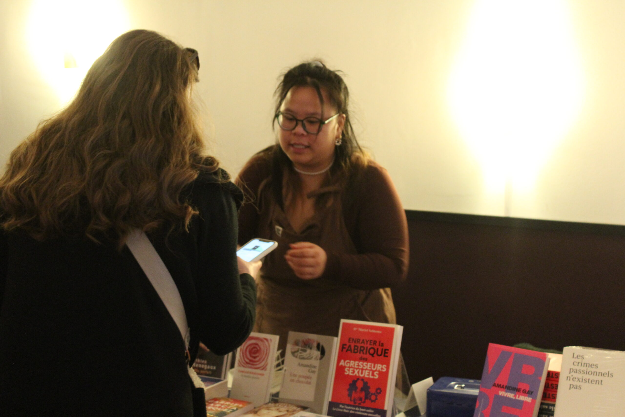 Durant l’après-midi, la librairie L’art d’aimer a tenu un stand avec une sélection d’ouvrages sur la thématique. Tout l’événement a été traduit simultanément en français et en allemand par Veronika Westphal.